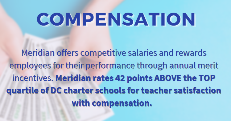 A TNTP Insight Survey of our staff placed our staff’s satisfaction with compensation at Meridian PCS in the top quartile of all charter schools in DC. We also lead the charter sector in compensation transparency and publish our salary scale for teachers here.