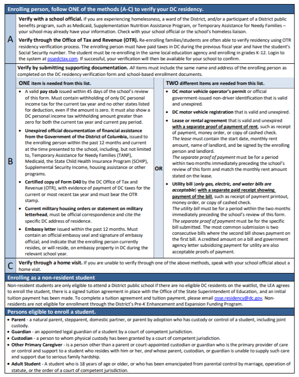 Valid documentation of DC Residency: The District of Columbia may use whatever legal means it has at its disposal to verify residency. Providing false information or documentation may result in the payment of retroactive tuition, withdrawal from school, and referral to the DC Office of the Attorney General for prosecution. The chart to the right displays valid documentation of DC residency ——->